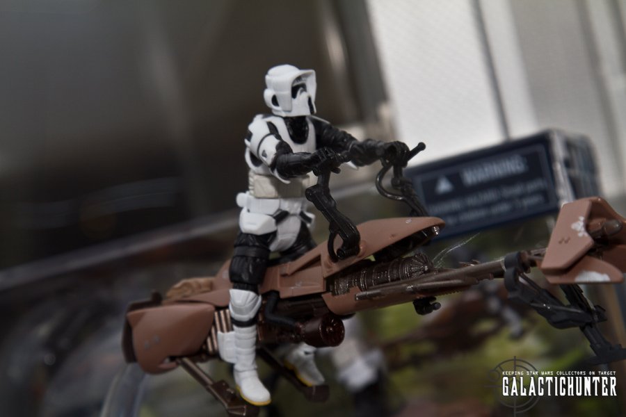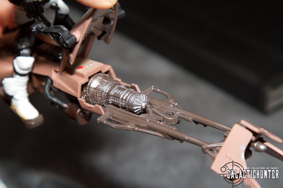 The all new Speederbike is quite spectacular and impressive. It's scaled accurately and features an opening panel to reveal the engine, detachable front nose cannon, and excellent paint detail. An almost all new super articulated Biker Scout is included as well as a clear stand for display. This ToysRUs exclusive was shown in Movie Heroes packaging, but don't count it out being presented vintage Kenner style in the future.