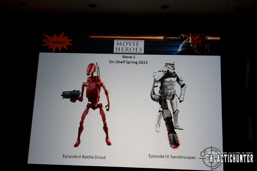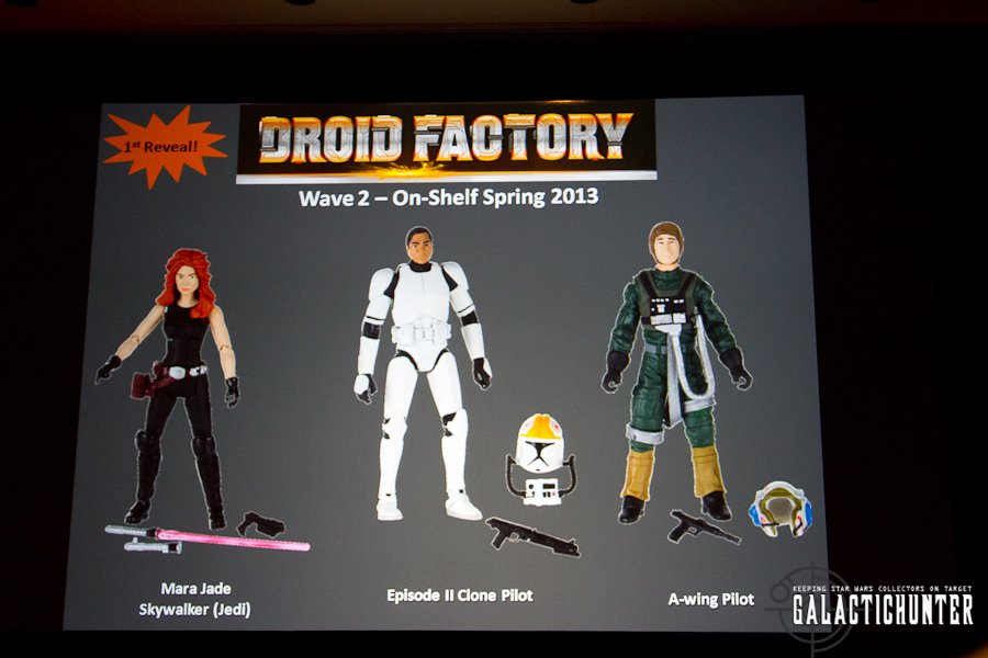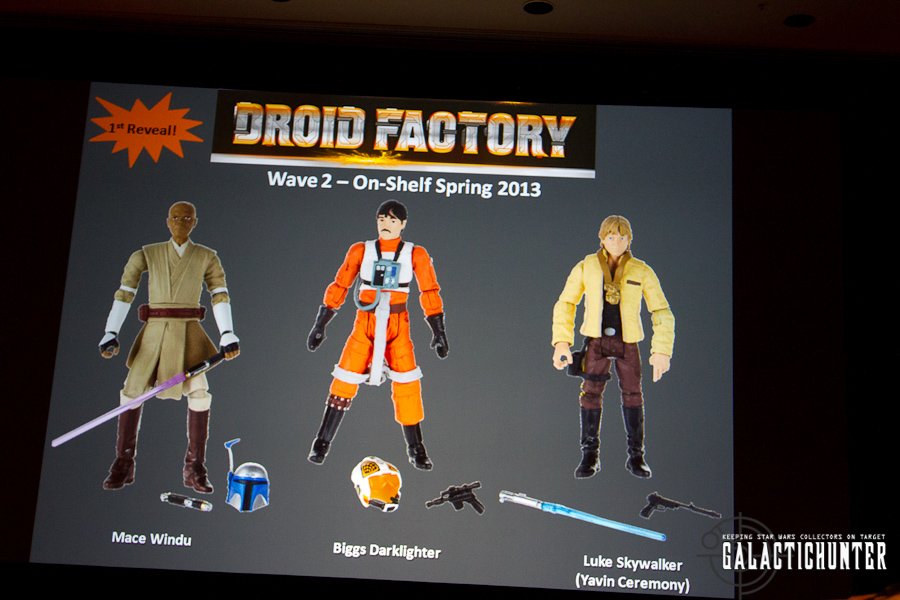 Droid Factory will be back in February, 2013 with 30 or so figures over the course of the year. Each wave will have 1 or 2 droids and, as always, it will include a unique piece of robot with every figure. Wave 2 is shown here for the first. The astromech-style cardback will hold new figures like Clone Wars Mace Windu, a taller (they specified height) Super-Articulated Pilot Biggs Darklighter, and a refresh of 2007's 30th Anniversary Collection Luke Skywalker (Yavin Ceremony) with a new blaster and head. "We want to get to 100 Lukes in 5 years," Derryl joked. Other figures in wave 2 include Mara Jade Skywalker, Episode II Clone Pilot, and another A-Wing Fighter Pilot. The Clone Pilot is a revised 2011 Vintage Clone Trooper body, the A-Wing Pilot is based on the 2007 body, and Mara Jade, as the fan's choice, is totally new with a new blaster, 2 lightsabers (lit and unlit), and a new blaster. They said Mara's hair is a separate molded piece, which should be evident by the photography. "It keeps the spirit of vintage going," DePriest said," just in a different card format." The wave is rounded out by a new Darth Vader (Bespin) with the banquet accessories like Han's blaster, a blast effect, a lightsaber, and swappable hands based on the 2005 Evolutions sculpt. Captain Rex is a realistic take on the 2008 Clone Wars cartoon armor, and seems to use a mix of existing parts and many many new ones. I like what I see and I think you will too.