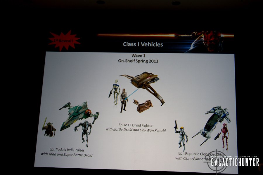 Class I Vehicles each include 2 figures instead of 1 this time around. The wave will include a mini awesome Episode II- Yoda's Jedi Cruiser with Yoda and a Super Battle Droid. The MTT Droid Fighter will connect to this year's MTT with a Battle Droid pilot and Obi-Wan Kenobi. The Episode II Republic Clone Dropship is a redeco of this year's red one, but in blue with a Clone Pilot and Battle Droid. Mini-Rigs are back, people! Good times. Yoda's Jedi Cruiser is probably my favorite, and is a removable build-a-droid piece you can swap out at your leisure. The best part of all of these is that they're wave 1 2013 releases, which means a new SKU, which means that "wave 1 syndrome" of things being widely available hopefully will apply here.