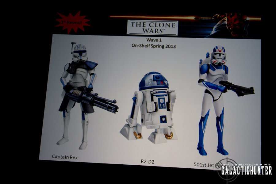 Clone Wars Wave 1 has brand-new versions of Obi-Wan Kenobi, Anakin Skywalker, and a Battle Droid which I think may be a repaint. Captain Rex is refreshed with new deco and a non-firing weapon that will spin, R2-D2 is cleaned up and is based on the newer Astromech mold Hasbro has started using, and a 501st Jet Pack Trooper is blue and looks spectacular. He's also the wave's debut, due in Spring 2013.