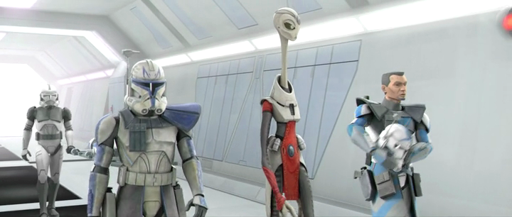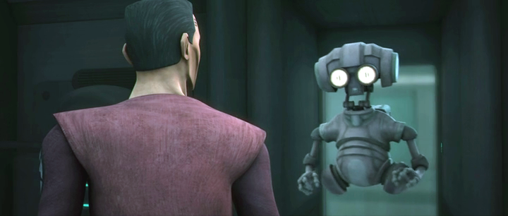 So what about Tup? Brain tumor. Apparently that's what caused him to flip out last time, and it's easily removed with the magic medical technology on Kamino and the work of AZ-3 - another fun droid in a parade of awesome characters that will never exist in toy form. He's another quirky little guy who helps Fives discover the tumor, which is an odd variation on the medical drama. Normally you have one guy pop in and solve every medical problem each week, and in this case we see a soldier come in and basically force an examination and solve the mystery with a little help from a mechanoid. Not a bad twist, but we're still stuck on the hospital and we're probably going to be here at least for most of next week, too. Bleh. I have no doubt this was to keep the budget down after last week's action-fest.
