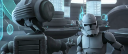 Kamino's dull grey hallways are once again the center of attention, with the added benefit of having few or no new character designs thrown in to keep it interesting. AZ-3 returns, sounding like a more competent and oblivious WAC-47, showing us that the animators may be frustrated toy designers - the little guy has a hover mode!