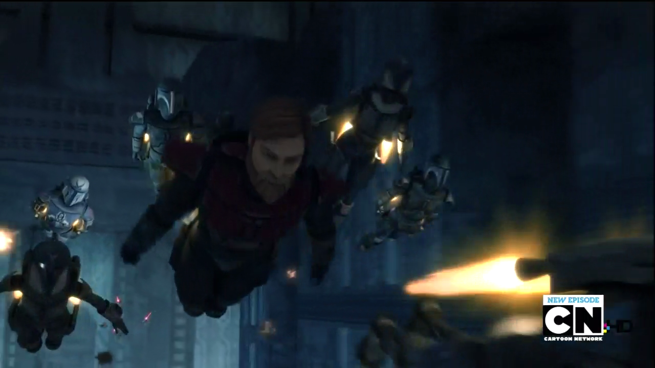 One notable yet bizarre thing about the serialized nature of The Clone Wars is that during a story arc, which are now seemingly 4 episodes as required by law, the perspective will shift from one week to the next. For the last two weeks it was mostly about watching Darth Maul's story, but the camera's sympathies this time clearly lay with Obi-Wan Kenobi. His appearance marks a giant nostalgia bomb, with the return of Anakin's awesome ship the Twilight, Rako Hardeen's suit (itself descended from a McQuarrie Boba Fett concept), plus numerous lines of dialogue and situations recalling the "Death Star" chunk of the original Star Wars movie. If you're the kind of person who bathed themselves in Star Wars lore for a significant part of your life, this rescue mission-gone-wrong does not disappoint.