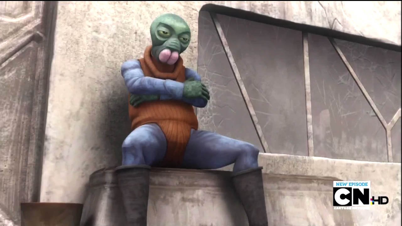 The reason for this is because the diner's owner, Mr. Borkus, doesn't want him reminding his dishwasher who he is or where he came from. The chubby Sullustian carries a vaguely Russian or Eastern European accent, and (surprisingly) actually has hair. Sure, he's going bald, but... hair. I like the hat. It has little burgers on it. Kudos on great character design there, particularly for a body type which I assume will not be recycled later on the series.