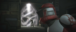 While Fives previously went into hiding by donning a shiny suit of normal Clone's armor, when he goes on the run this time he hides by wearing... a hat. When the hat comes off he gets discovered, of course, but it still means that the highest levels of technology in this galaxy can fall prey to the kind of thing Justin Bieber might wear. It's a nice look for Fives, though, particularly with the beard - anyone not knowing his backstory might just assume he's the evil clone.