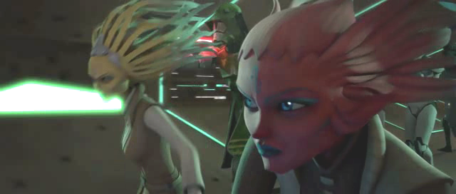 New Jedi Tiplar and Tiplee are a new race of aliens, and the twin Jedi make up a big part of the emotional core of this episode. Clone Trooper Tup basically wigs out and slaughters one of the warriors, resulting in the space station battle being aborted and now we get to suffer through the worst kind of mystery: one to which we basically know the answer, and then we reveal that the Sith know the answer, too. So why tell this story? I have no idea.
