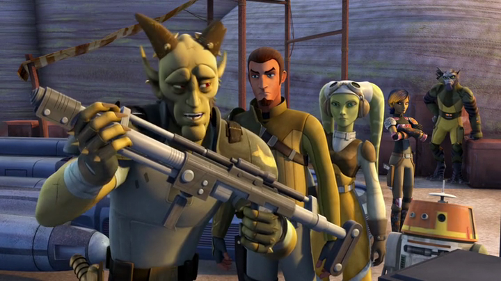 The story is fun and familiar - R2-D2 and C-3PO show up with some Imperials looking to make a gun delivery for very new, very fancy, very Zeb-genociding weapons. The crew is hungry and wants to make some money, so they argue about selling weapons to Quark Hondo Ohnaka Cikatro Vizago, the Devaronian arms dealer. The plot is a lot more interesting than the usual "let's go in and kill" vibe of many action shows, as the team basically splits up on a space bus to cause havoc. Chopper and Ezra bicker with Kanan, while Zeb and Sabine pretend to be Empire-friendly travelers with the ability to help translate Aqualish after their translator droids get sent to the back of said space bus. A little obfuscation through translation, and presto - guns stolen! It's a brisk caper that reveals that these guys are all getting along quite swimmingly.
