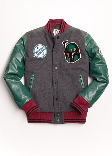 Keep warm and on target sporting this cool Boba Fett Varsity jacket that comes with all the appropriate emblems in their proper place that includes a Mythosaur arm patch and Fett helmet emblem. (Buy from Marc Ecko)