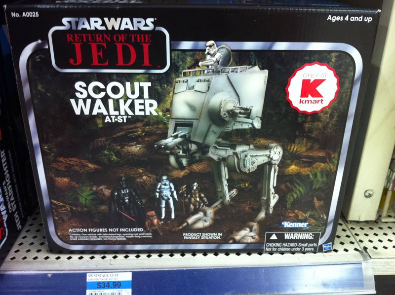 Also available this week from K-Mart is their new exclusive Vintage Scout Walker. Besides the awesome new Vintage packaging, Hasbro applied new Endor deco, including the front nose "scar". The AT-ST retails for $34.99 and the UPC is 6-53569-76203-4. The AT-ST Driver and Ewok 2 Packs are not yet in their system, but the UPC for the drivers is 6-53569-77945-2 according to our friend DarthChuckMc on Twitter.
