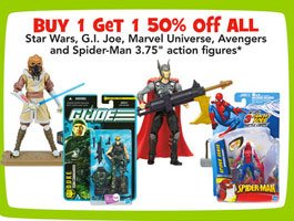 ToysRUs is having a Buy One Get One for 50% off for their Star Wars 3.75 inch action figures. While there hasn't been any recent sightings of new Movie Heroes or Vintage Figures at TRU, this may be a good chance for you to justify buying those re-packs at a cheaper price. Or not. Or maybe you can find the new Deleted Scenes figures if you still need them. Click here to shop at ToysRUs.com.