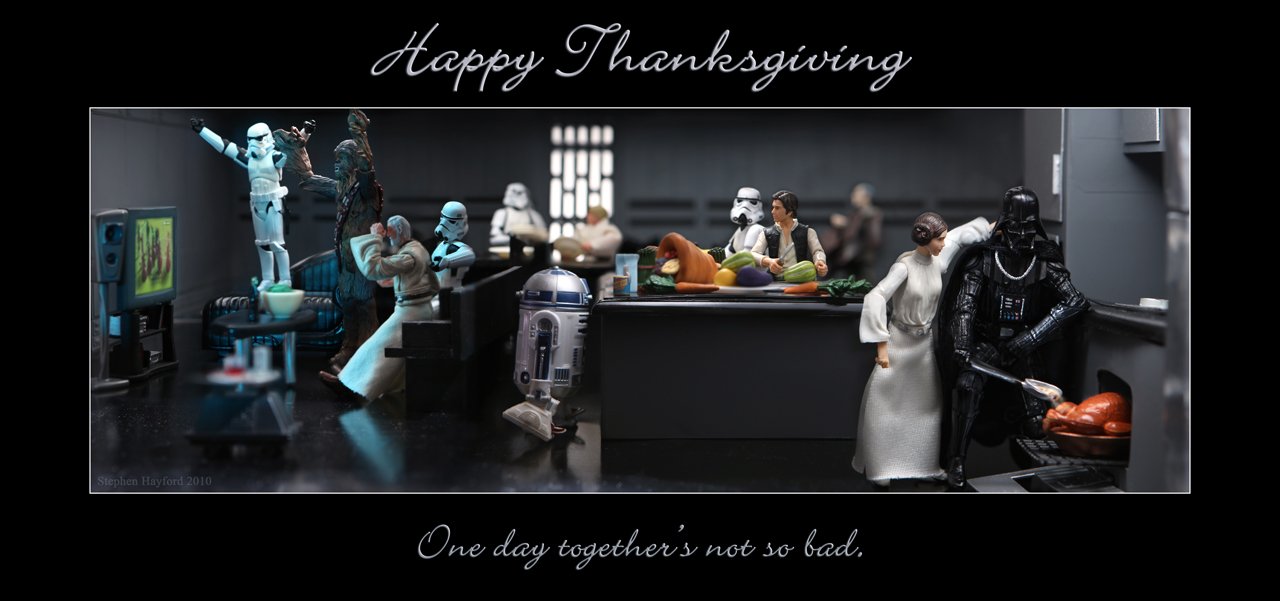 Galactic Hunter wishes a Happy Thanksgiving to you and yours. This hilarious diorama featuring your favorite Star Wars action figures courtesy of photographer Stephen Hayford.