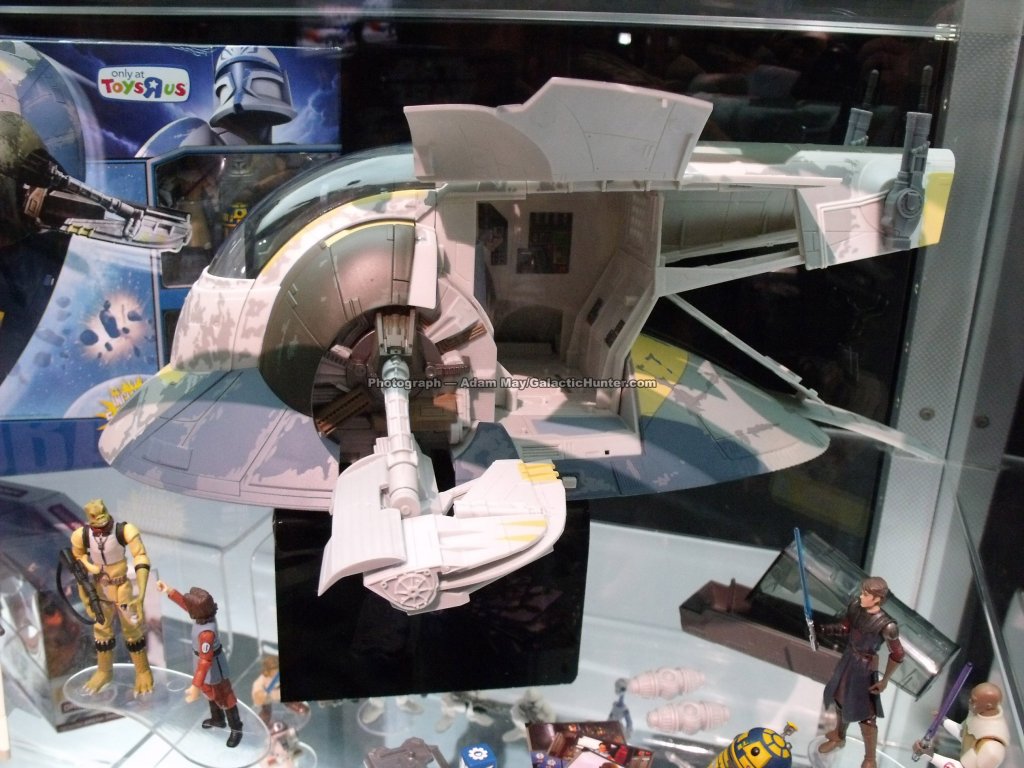 For $99.99 at (sadly) Toys'R'Us we can buy the all-new Slave 1 from The Clone Wars and FIVE figures plus Mace Windu's Jedi Starfighter, which, if sales go well, could (well, it's likely to) lead to an Empire Strikes Back version of Slave 1 (the rumor-mill has this already set as an exclusive to Target stores — we're awaiting confirmation) and an Attack of the Clones (a/k/a Jango Fett Slave 1). We could also see a pretty general-purpose Mandalorian Interceptor, too! Does Boba Fett (circa The Empire Strikes Back) need an escape pod? What is it for? We'll find out (eventually). In the meantime, YOWZA, doesn't this set pack a lot into it?