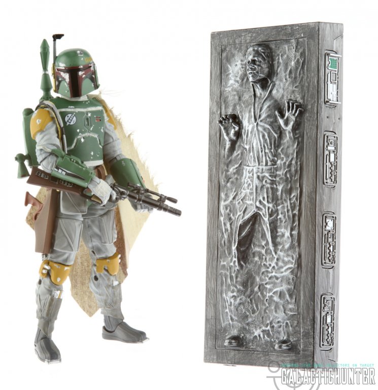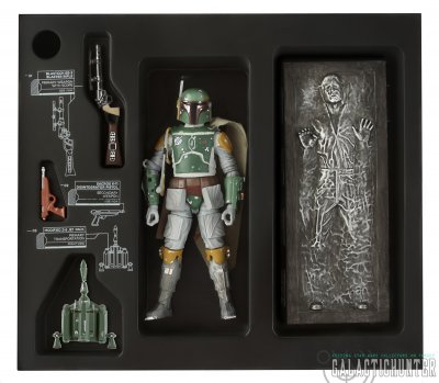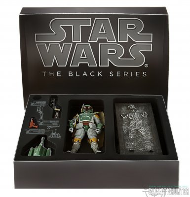 The specially packaged set comes with the new Black Series 6 inch scale Boba Fett with a show exclusive Han Solo with Carbonite accessory. The Fett figure will also be available as a general release item once The Black Series line officially launches in the fall.