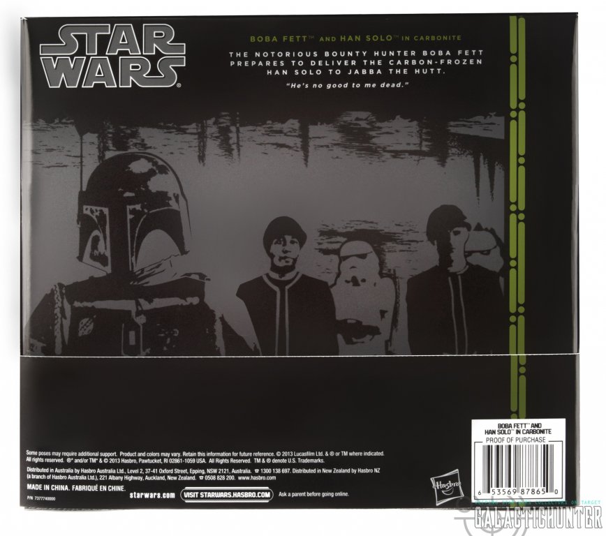 The new Black Series premieres in fantastic fashion with two of the more iconic characters of the Original Trilogy (who will also reportedly star in their own stand alone spinoff films in 2016 and 2018). Presenting Hasbro loose and packaged photos of the hotly anticipated Comic-Con 2013 exclusive Black Series Boba Fett with Han Solo Carbonite.