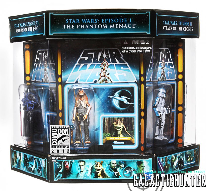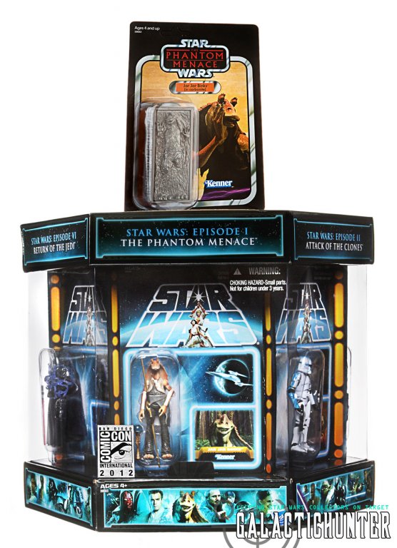 Pretend to visit an alternate reality with this incredible package of seven 3.75-inch STAR WARS figures—one figure from each film in the Saga, and one figure only available in this collectible set. Each figure is individually carded with packaging that pays tribute to a “lost” line look that Kenner considered before going with their classic black-and-silver look! This Comic-Con special edition pack will be fans’ first chance to get the “lost” packaging, available this fall as variants in the STAR WARS VINTAGE COLLECTION line. In addition, this special collector’s pack will be the only place to get an exclusive treat for fans— a 3.75-inch carded JAR JAR BINKS in CARBONITE, which will be hidden in the center of the packaging and can be revealed by raising it through the “CARBONITE CHAMBER” top of the case. The other figures included are a standard JAR JAR BINKS (EPISODEI), CLONE TROOPER LIEUTENANT (EPISODE II), SHOCK TROOPER (EPISODE III), SANDTROOPER (EPISODE IV), PRINCESS LEIA (EPISODE V) and DARTH VADER (EPISODE VI).