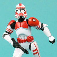 The 2005 Revenge of the Sith Clone Trooper figure with "Quick Draw" action feature is re-released for the 2012 Movie Heroes assortment. The Shock Trooper also includes a character card, figure stand, and die for the Galactic Battle game.