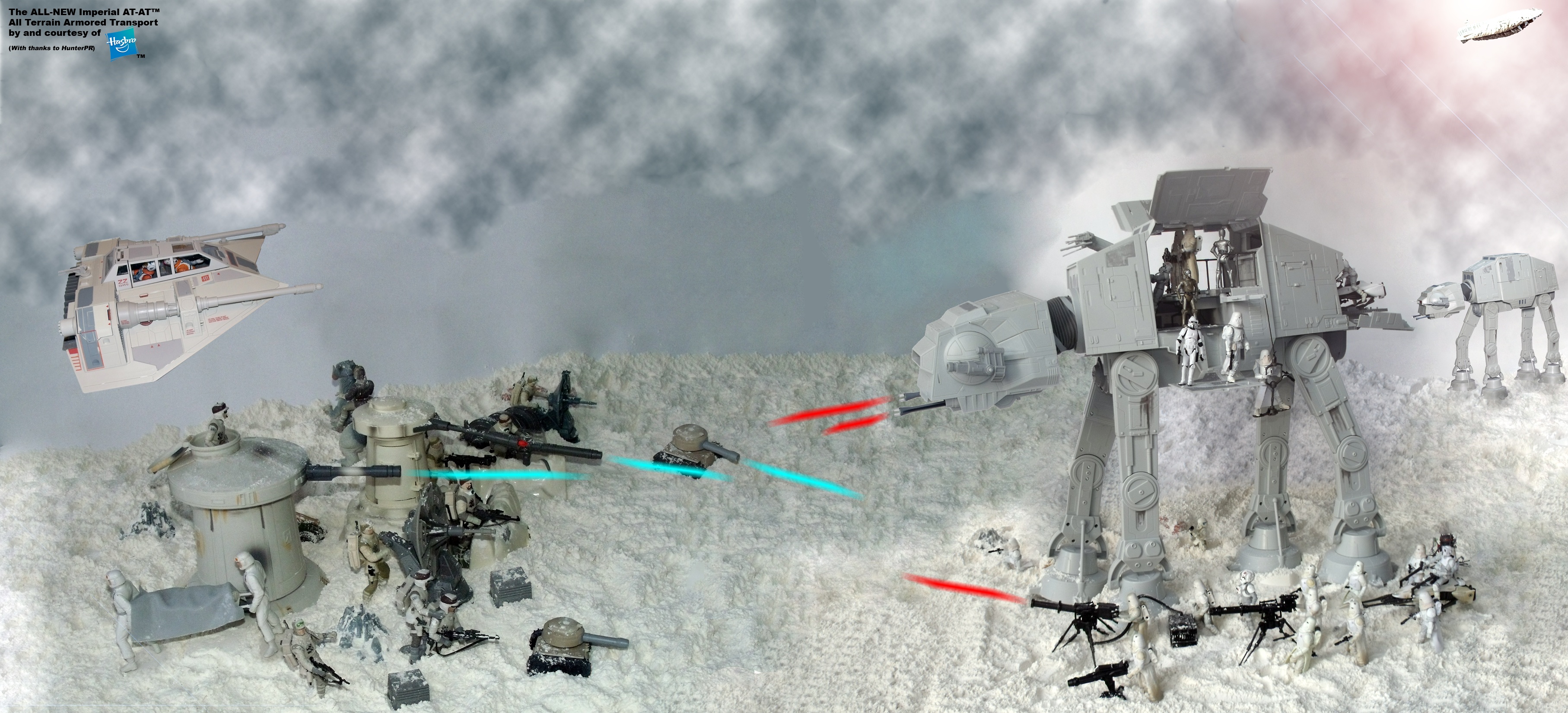 Since not all of our Imperial AT-AT Walkers were asked to take part in the 11:38 "sneak attack" series, we were heading in another direction. This is the first of a series of photo montages of the new Imperial AT-AT "in play". We assume that this part of Blizzard Force is taking on the first wave of Rebel scum (no relation) to make way for Darth Vader's arrival. (Once again, note that the all-new Imperial AT-AT comes with ONE (1) AT-AT Driver and ONE (1) Speederbike.) Some of the products shown are not currently available at retail, but we hope they're in your collection anyway.