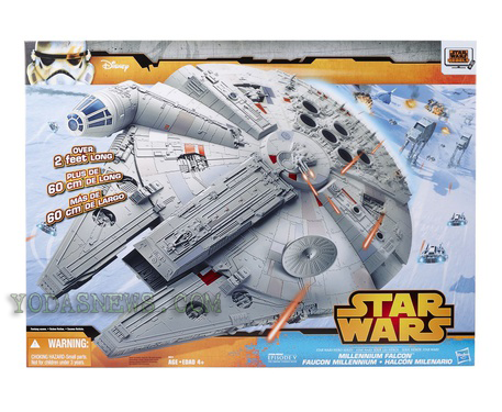 A giant X-wing is en route from Hasbro, and YodasNews.com shows it won't be alone. A Millennium Falcon of generous proportions - seemingly the 2008 Big Millennium Falcon minus figure compatibility and electronics - is on the way. The packaging boasts it's over 2 feet long, and Yoda's News says it may be a Walmart exclusive. Click here to see it.