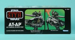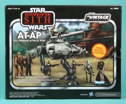 It's all in the packaging and when it comes to the classic Kenner black and silver, Hasbro knows they have gold amongst nostalgic collectors. Presenting some boxed photos of the new The Vintage Collection Class II Vehicles featuring Obi-Wan Kenobi's Jedi Starfighter, the AT-AP, and V-19 Torrent Starfighter. These retail for $31.99 and are currently being spotted at ToysRUs.