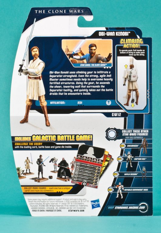 Bio: Obi-Wan Kenobi uses climbing gear to infiltrate a Separatist stronghold. Even the strong, agile Jedi Master sometimes needs help to overcome heavily fortified structures. Using the gear, he ascends the sheer, towering wall that surrounds the Separatist facility, and quickly takes out the battle droids that he encounters inside. [IMAGE BANK PHOTOS]
