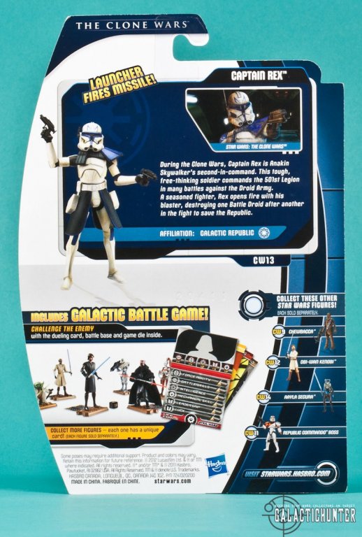 Components for the Galactic Battle Game are packed in with each 2012 Clone Wars figure that include a tan Star Wars action figure stand with an insertion for the character card on the back. The character card and six sided game die feature all the icons for the character's "life force" or hit points. Rex is particularly strong in his Battle and Mechanical skills and appropriately so.