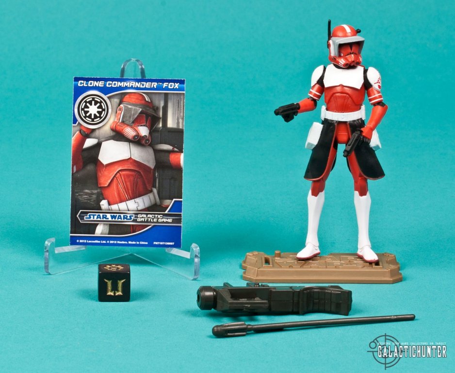 Components for the Galactic Battle Game are packed in with each 2012 Clone Wars figure that include a tan Star Wars action figure stand with an insertion for the character card on the back. There are also two notches on the rear of the stand to reveal and generate a "power boost". The character card and six sided game die feature all the icons for the character's "life force" or hit points. Commander Fox is particularly strong with Battle Skills (12 points), Leadership (11 points), and Inventory Control. I kid on the last one, of course.