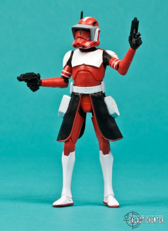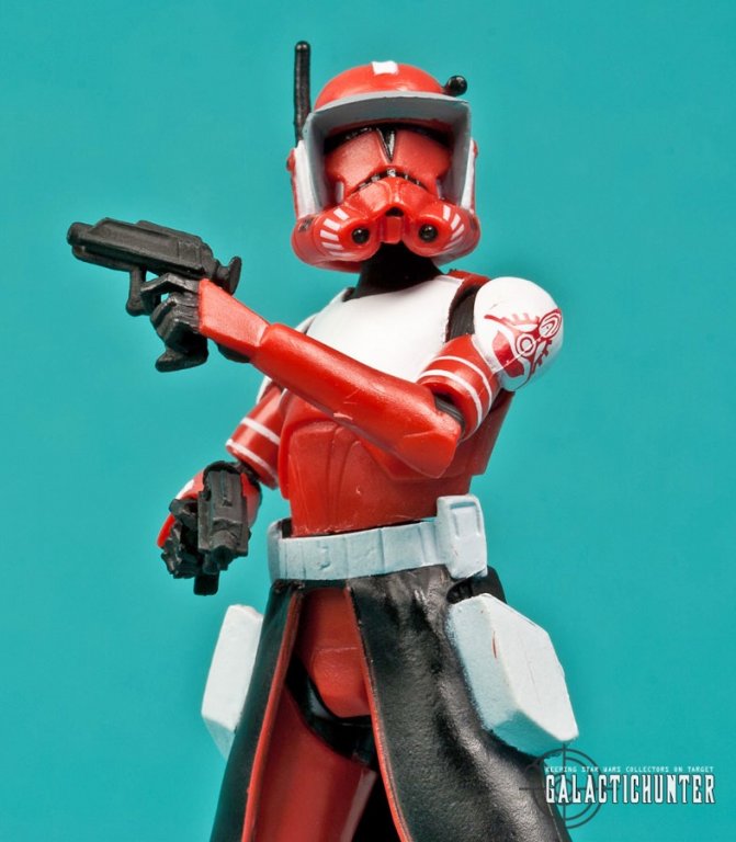SCULPT/PAINT: Commander Fox in his Phase I armor was released as a Target exclusive in 2008 that quickly sold out. His Phase II armor has a lot more (Target) red with white accents and the Coruscant Guard symbol is now more discretely placed on his left shoulder plate rather than on his chest, which I prefer. The non-removable helmet features the distinct visor that's also seen on Commander Cody and the torso is re-purposed from the 2012 CW02 Clone Trooper. Fox also shares the same molded kama, functional holsters, and (sadly) lower legs of the new Captain Rex and Commander Wolffe.