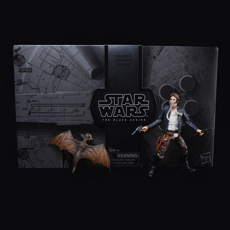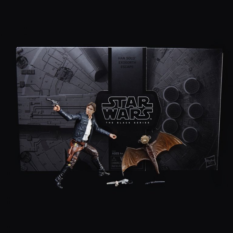 Sometimes we get exclusive figures, sometimes we get sneak peeks with exclusive gear. The STAR WARS: THE BLACK SERIES HAN SOLO AND MYNOCK figures are a surprisingly fair $34.99 in a big fancy box that recalls the awesome Boba Fett from 2013. Han has a breathing mask, Mynock, and some other goodies. The box reads "Exogorth Escape," and if that seems baffling that's because you missed the Knights of the Old Republic comic books that gave a name and backstory to the big space slugs. Mystery is dead, but the hunt lives on - more pictures and press info after the break.