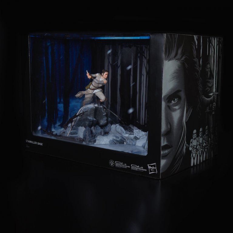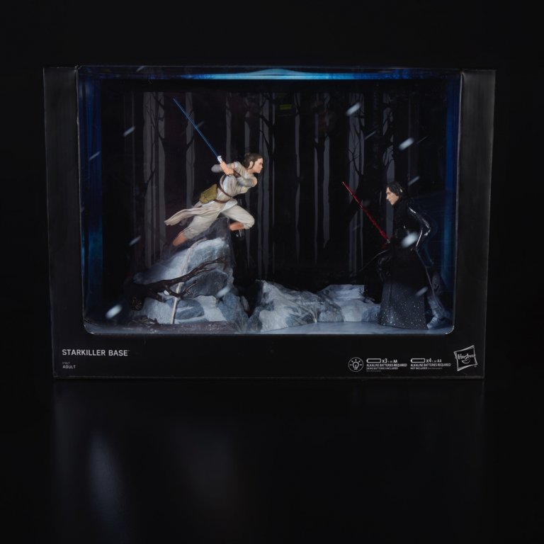 Reimagine key moments from the STAR WARS galaxy with THE BLACK SERIES CENTERPIECE REY (STARKILLER BASE) & KYLO REN FIGURE! Imagine REY battling KYLO REN in the icy forests of STARKILLER BASE in STAR WARS: THE FORCE AWAKENS. Includes a premium, highly-articulated KYLO REN figure, a water mister for steam effects, and an acrylic light-up backdrop, which are all exclusive to this set. Requires 3 AA batteries, not included. The STAR WARS: THE BLACK SERIES CENTERPIECE REY (STARKILLER BASE) & KYLO REN Figure will be for sale at San Diego Comic-Con 2018. Limited quantities of this item will be available at select conventions and select online retailers after the convention in the relevant market (including HasbroToyShop.com where available). Good while supplies last.