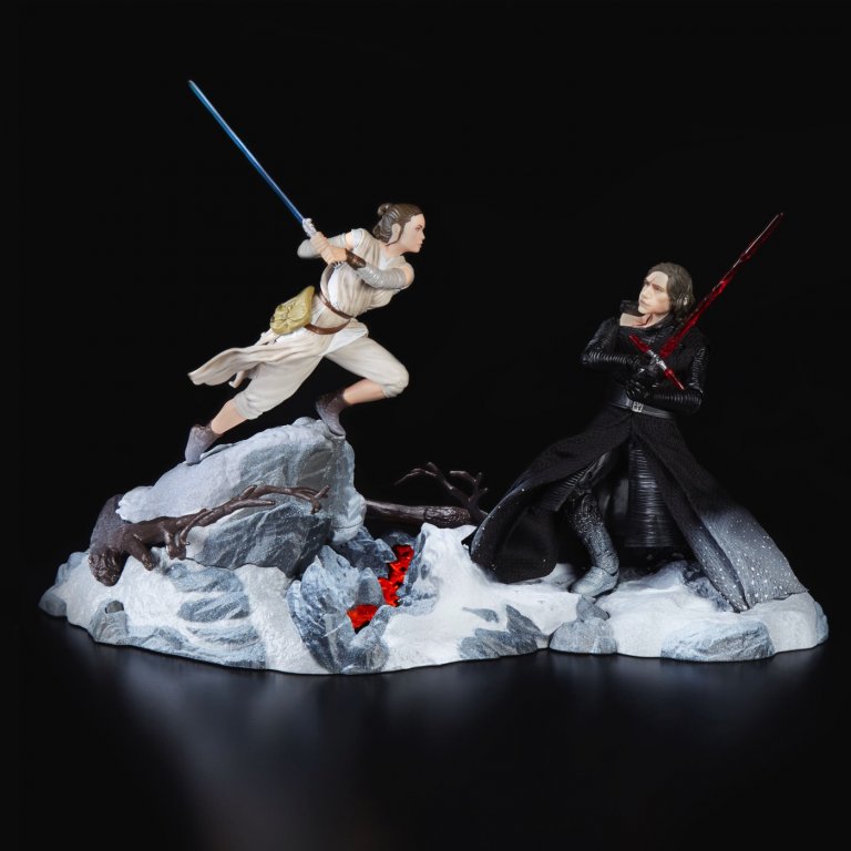 The Rey is a Centerpiece, meaning lights are yes and articulation is no. There's a misting system and a fancy light-up backdrop. Kylo Ren has a uniquely expressive face, a torn shirt, and lots of articulation. Also snow deco.
