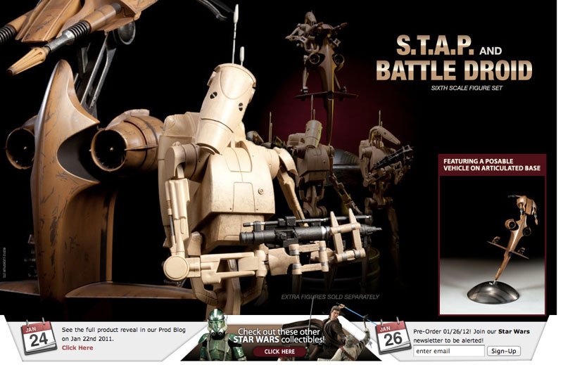 Sideshow has posted a preview of their upcoming STAP and Battle Droid 1/6th scale set. A full product reveal will be shown in their Production Blog on January 22nd and pre-orders will begin on January 26th. Sign up for their newsletter to be alerted!