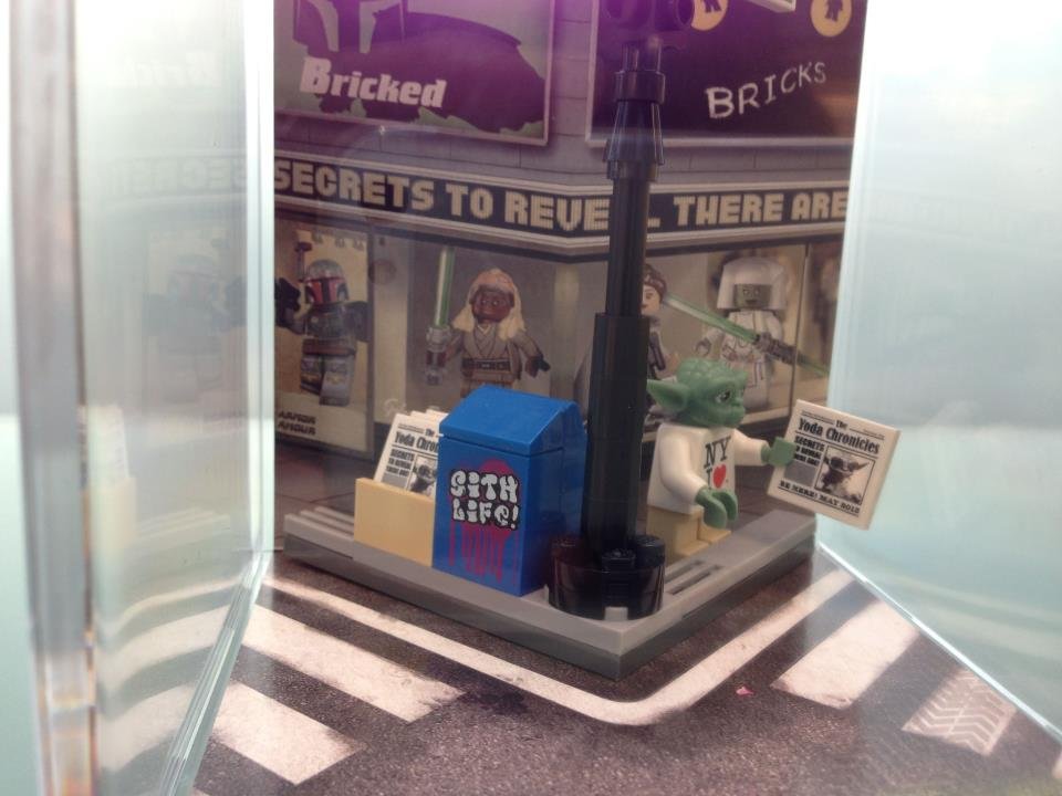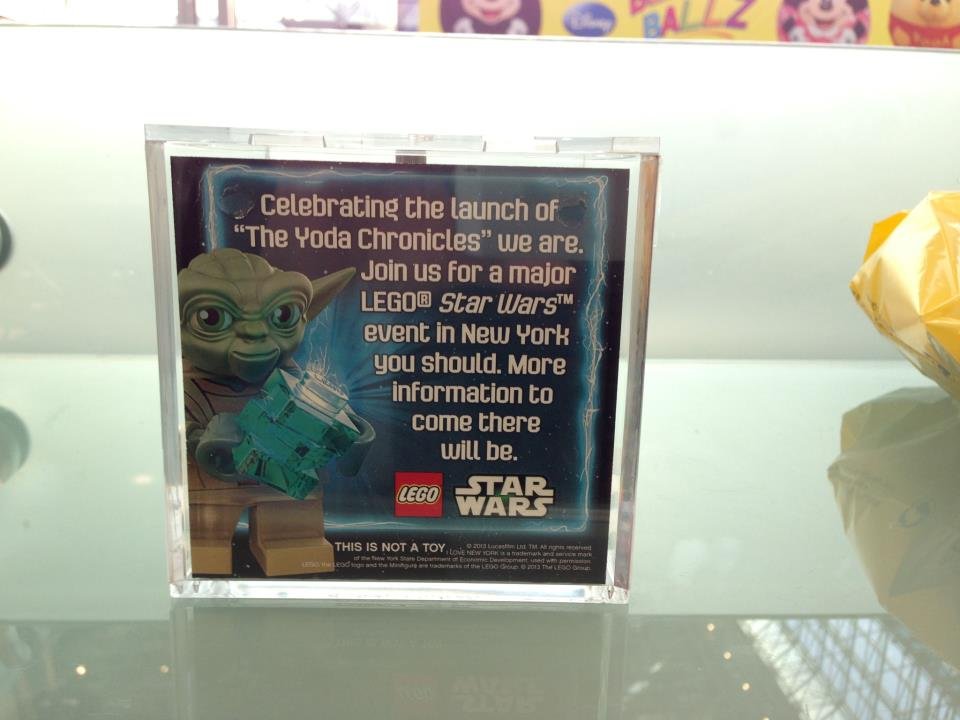 To celebrate the launch of the Yoda Chronicles, LEGO gave out a mini New York City diorama complete with several easter eggs and a Yoda minifigure holding a "Yoda Chronicles" newspaper with a "be here May 2015" headline. On the back is an announcement referencing a launch event in New York. The limited edition goodie is limited to only 150 pieces.