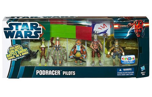 The ToysRUs exclusive Podracer Pilots Action Figure Pack is now online at ToysRUs.com. The set features re-issues of Dud Bolt, Clegg Holdfast, Gasgano, Mars Guo, and Teemto Pagalies as well as their flags. It's in stock now and retails for $26.99. Click here to order!