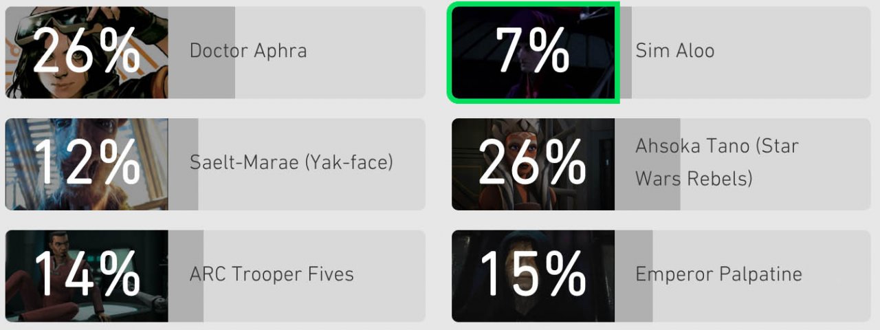 Palpatine (and Fives for that matter) strike me as suspicious. Was Fives even on anyone's list? I do like Aphra, but my vote goes to Sim Aloo. Just finish the original 92 already.