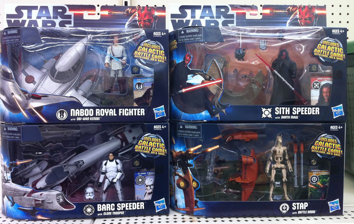 New product is trickling in to stores for the New Year. We found the new wave of Deluxe Class 1 Vehicles at a Walmart in San Diego, CA. This wave includes the Naboo Royal Fighter with Obi-Wan Kenobi, Sith Speeder with Darth Maul, Barc Speeder with Clone Trooper, and STAP with Battle Droid. Happy Hunting!